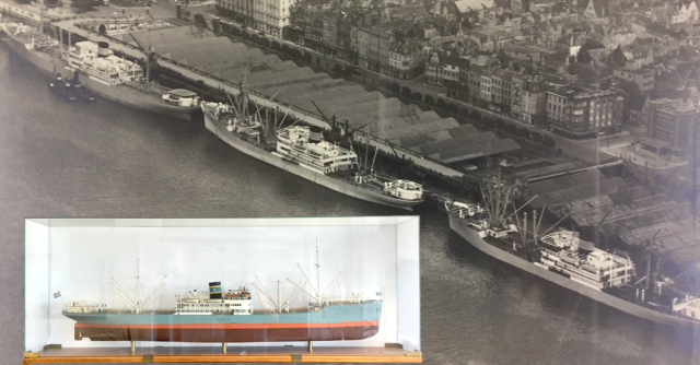 Below a photo of three Johnson Line vessels lined up for loading/discharging cargoes to and from South America at the river Scheldt quay side in Antwerp. The pictured reduced model shows the m/v Amazonas of Johnson, the first vessel of the line to call Antwerp after the second world war in 1945. The vessel berthed at Schelde Quay 21, in the shade of the “Cathedral “ and the ‘Boerentoren’.